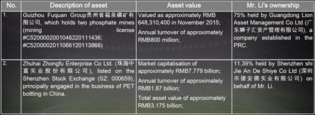 Capitolo a parte è quello delle miniere di fosfati in Cina, un minerale strategico per l’agricoltura, attività che il governo cinese promuove con forza. Tre mesi fa sono circolate indiscrezioni giornalistiche che hanno messo in dubbio questa proprietà, che nei documenti presentati alle banche, genererebbero un giro d'affari di 800 milioni di renminbi (cioè 108 milioni di euro). La stima di valore fornita è un po' datata: a novembre 2015 varrebbero circa 648 milioni di renminbi (cioè 87 milioni di euro). A Mr Li fa capo il 75% delle miniere: per un valore di 65 milioni.