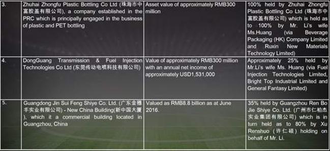 Qualche piccola partecipazione è anche in mano alla moglie di Yonghong Li: come la Zhuhai Zhongfu Plastic Bottling, che la signora Huang possiede tramite la Beverage Packaging Company Limited e la Ruxin New Materials Technology. La Zhuhai Zhongfu Plastic Bottling Co Ltd verrebbe valutata circa 300 milioni di renminbi (cioè 40 milioni di euro). Tra le altre attività in mano alla moglie di Mr Li ci sarebbe anche la DongGuang Transmission & Fuel Injection Technologies (valutata circa 300 milioni di renminbi) della quale Ms Huang dovrebbe possedere circa un 25%.