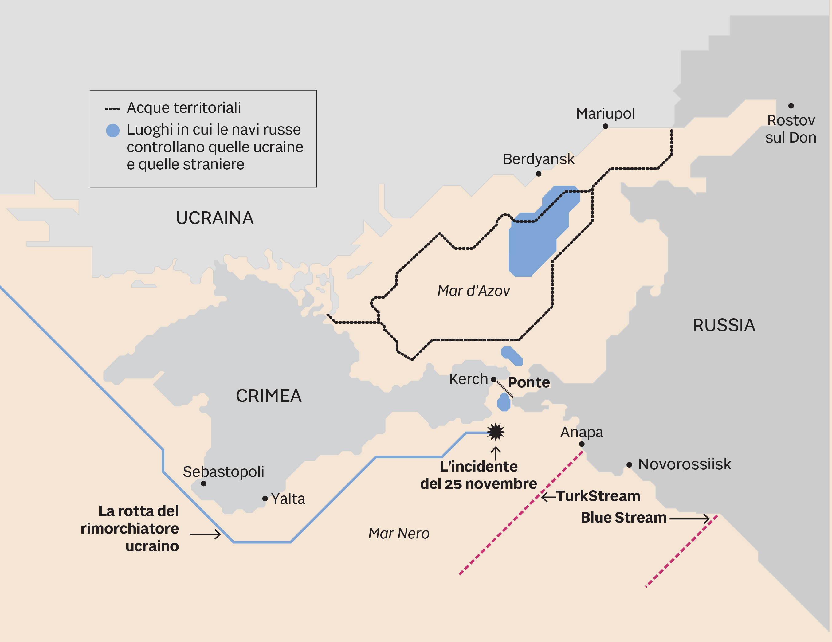 Se l’accordo è sopravvissuto alla perdita ucraina della Crimea, è stato il ponte a cambiare le cose. Ormai nel Mar d’Azov all’Ucraina sono rimasti 300 km di litorale - la costa settentrionale - con due grossi porti industriali: Mariupol e Berdyansk, importanti per l’esportazione di grano e acciaio, sedi di numerose compagnie ittiche. Anche i villaggi della costa vivono di pesca e commerci marittimi. Senza più libero accesso alla Crimea, a fianco la regione separatista di Donetsk: Mariupol è vicinissima alla linea del fronte.