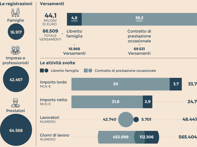 Libretto famiglia e contratto di prestazione occasionale. Registrazioni, versamenti e pagamenti dal 10 luglio 2017 al 5 marzo 2018 (Fonte: elaborazione Il Sole 24 Ore su dati Inps)