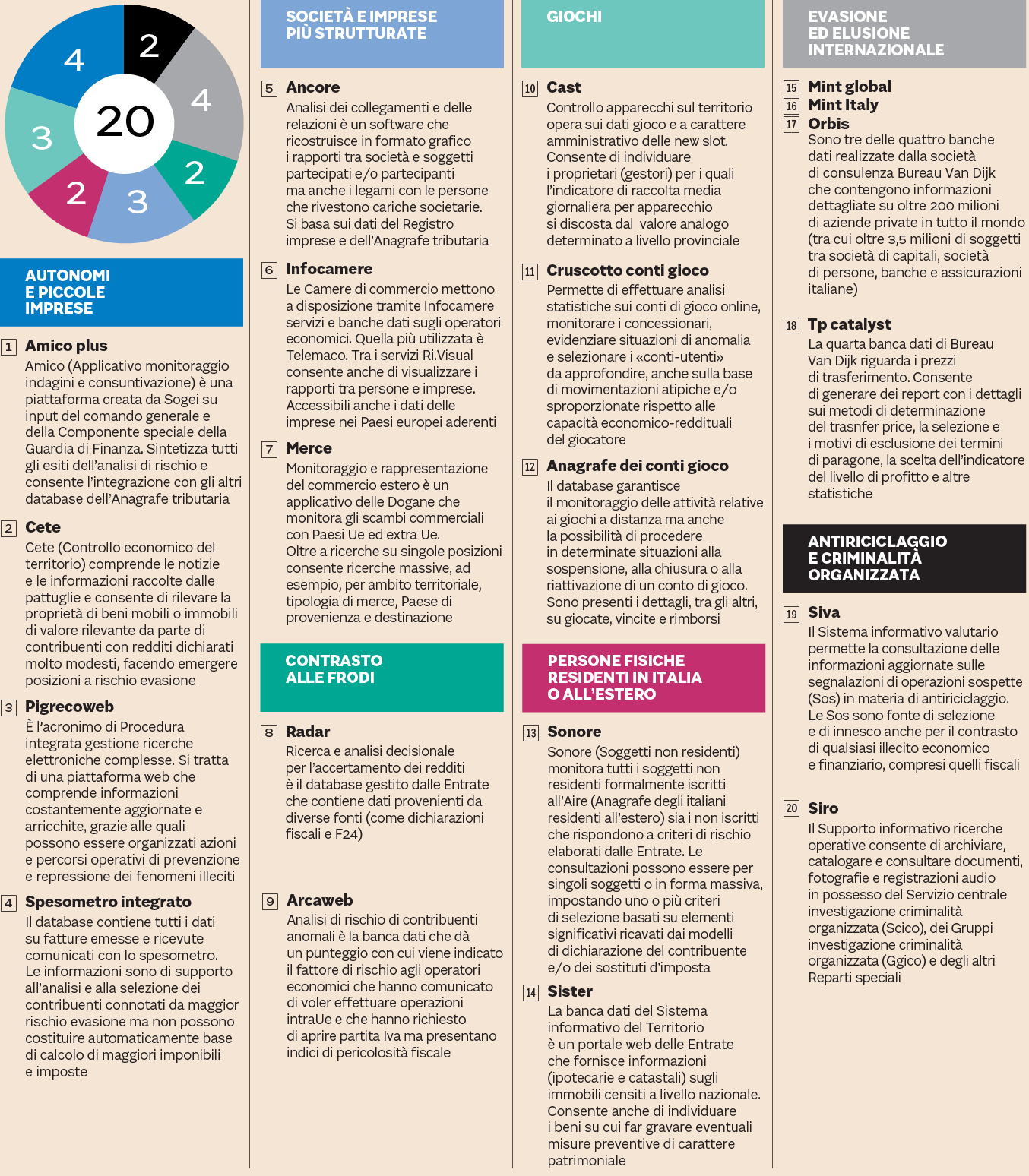Il patrimonio informativo delle 20 banche dati principalmente dedicate alla tutela delle entrate consente al Nucleo speciale di individuare un contesto di riferimento macro, quale ad esempio possono essere le frodi Iva o il gioco d’azzardo, per poi produrre analisi di rischio per intercettare fenomeni legati all’evasione, all’elusione e alla criminalità organizzata. Nessuna operazione di massa, sottolinea il comandante del Nucleo speciale. Si procede, invece, «in virtù del principio dell’oculata selezione degli obiettivi: cardine ineludibile per garantire la massima remuneratività all’attività di controllo, sia in termini di maggiore ed effettivo gettito, sia a sostegno della compliance, soprattutto in un sistema, come quello italiano, a fiscalità di massa, fondato su adempimenti spontanei dei contribuenti e connotati tutti da una patologica strutturalità dell’evasione/elusione fiscale».