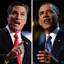 Nella foto lo sfidante repubblicano nella corsa alla presidenza degli Stati Uniti, Mitt Romney, e il presidente Barack Obama