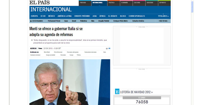 «Monti si offre per governare l'Italia se si adotta la sua agenda di riforme», titola El Paìs, che come tutti i quotidiani spagnoli segue con molta attenzione l'evolversi della crisi politica tricolore per le sue possibili ripercussioni su Madrid. «Monti ha sottolineato che il suo nome non apparirà associato ad alcun partito politico per non portare a scontri, e che è più interessato a che venga applicato il suo manifesto che a personalismi».