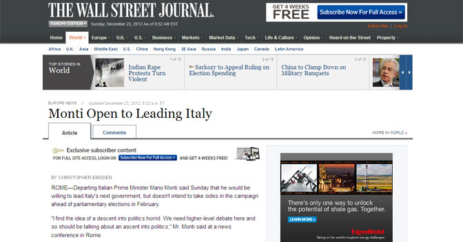 «Monti Open to Leading Italy», Monti disposto a guidare l'Italia, titola in apertura l'edizione online del WSJ: «il discorso di tre ore di mr Monti – sottolinea il quotidiano online della comunità finanziaria americana – ha deluso chi sperava in una chiara indicazione del se e come intenda scendere nella mischia politica in vista delle elezioni di fine febbraio. Al contrario, sembra lasciare aperte le sue opzioni».