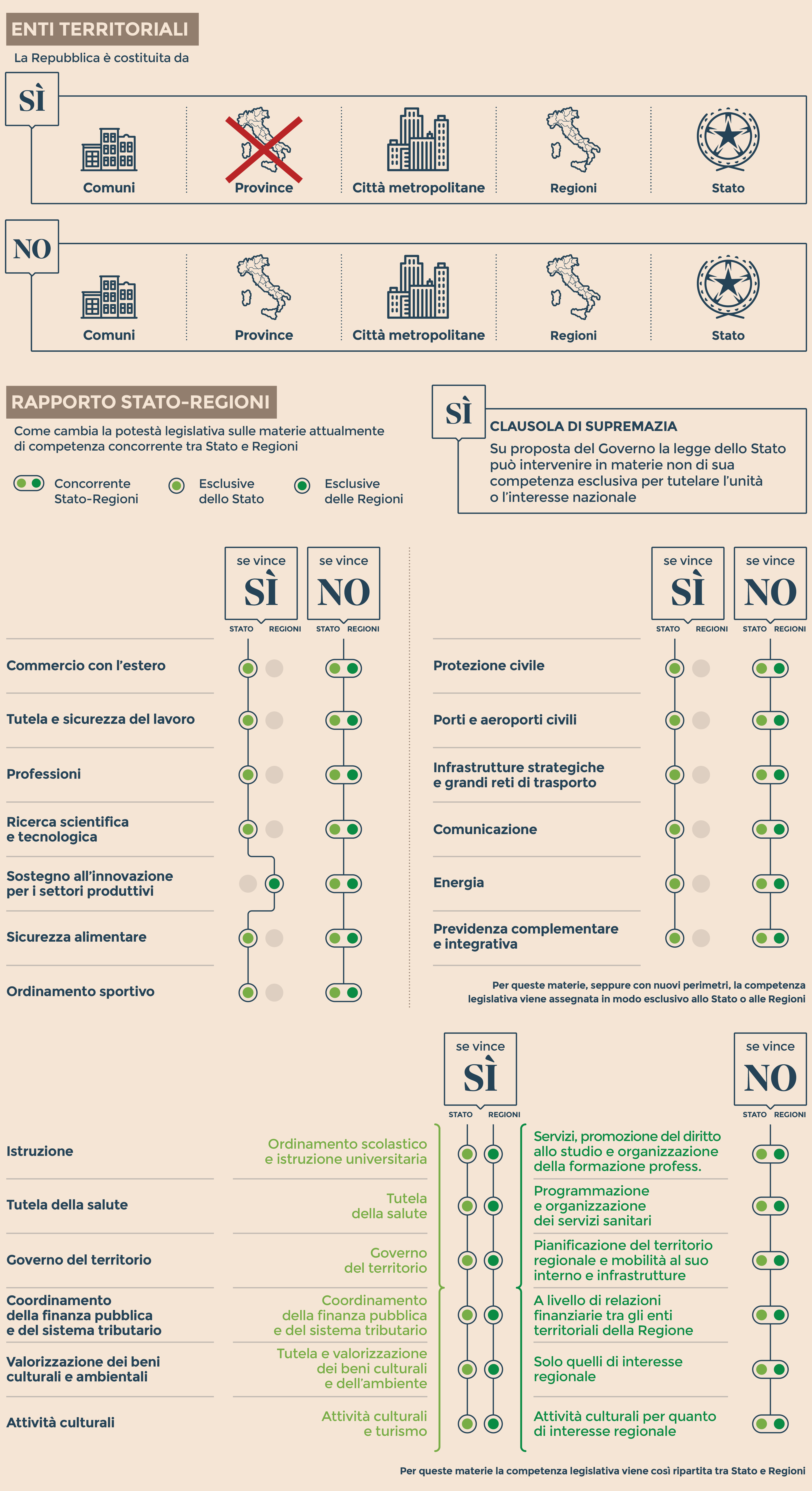 La riforma interviene in modo profondo sul Titolo V della Costituzione (dall'articolo 114 al 133) che disciplina il rapporto tra lo Stato, le Regioni, le città metropolitane e i Comuni. Innanzitutto se vince il Sì vengono cancellate, anche nella Costituzione, le Province. Inoltre, la legge costituzionale ridisegna la suddivisione della potestà legislativa tra Stato e Regioni (già oggetto del referendum costituzionale del 2001). In caso di vittoria del Sì, infatti, sparirebbero le materie concorrenti per cui attualmente sono competenti sia lo Stato che le Regioni. Dal commercio con l'estero all'istruzione, queste materie diventerebbero di competenza esclusiva dello Stato o delle Regioni, e alcune verrebbero ripartite tra i due. Inoltre, la riforma introduce la cosiddetta clausola di supremazia: se vince il Sì, su proposta del Governo la legge dello Stato potrà intervenire in materie non di sua competenza esclusiva per tutelare l'unità o l'interesse nazionale