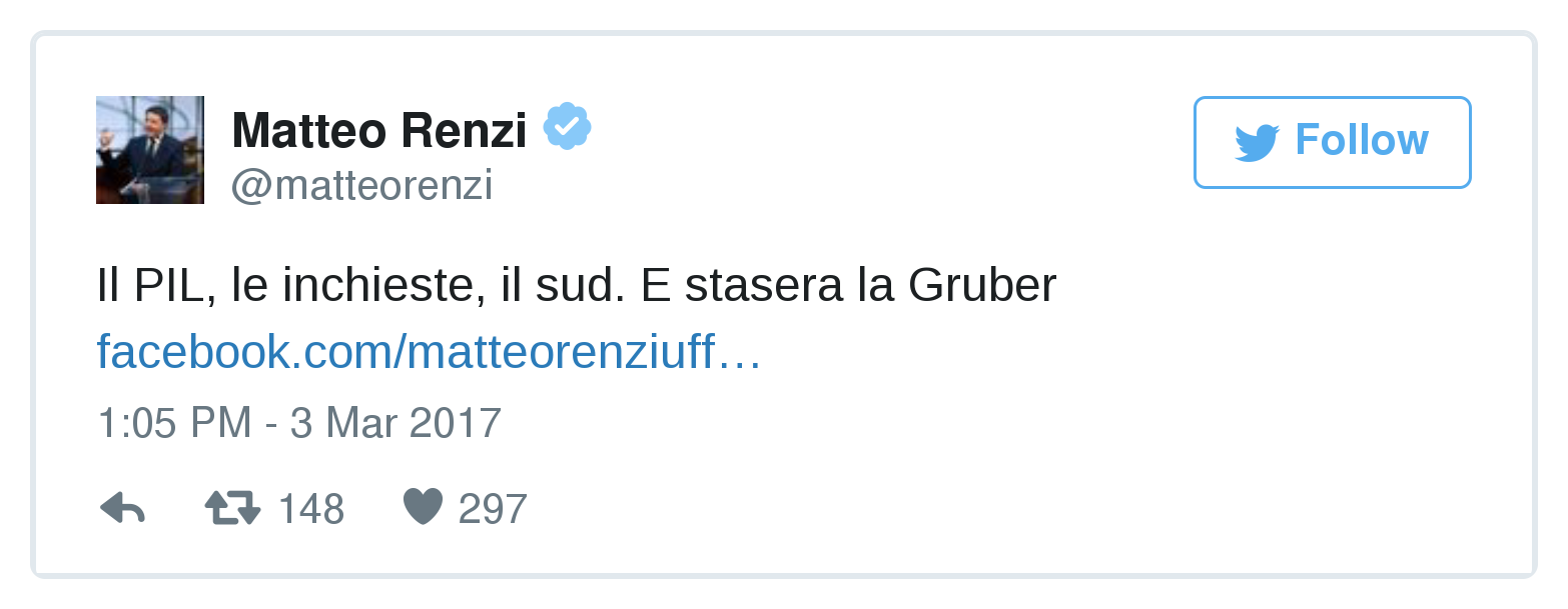 Con il suo post Renzi, dunque, Renzi spazzia via ogni dubbio e annuncia: che staserà sarà ospite da Lilli Gruber a Otto e Mezzo su La 7 «per affrontare tutti i temi dell'attualità - scrive - a viso aperto, come sempre».