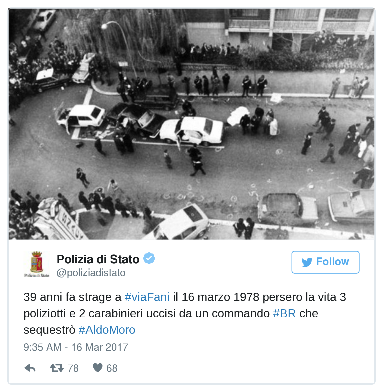 Nella strage di via Fani avvenuta 39 anni fa persero la vita, come ricorda la Polizia in un tweet, tre poliziotti e due carabinieri, uccisi dal commando delle Brigate Rosse che sequestrò Aldo Moro.
