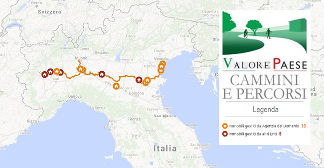È un tracciato di circa 680 km che collega Venezia a Torino. Corre lungo il fiume Po, in parte sugli argini, in parte lungo ciclabili esistenti e su tracciati ancora da attrezzare, attraversando Veneto, Emilia Romagna, Lombardia e Piemonte, e interessando 120 Comuni. Quindici gli immobili coinvolti, dalla caserma Gdf di Venezia al Molino di Certosa di Pavia, fino alla casa degli Archi di Morano sul Po.