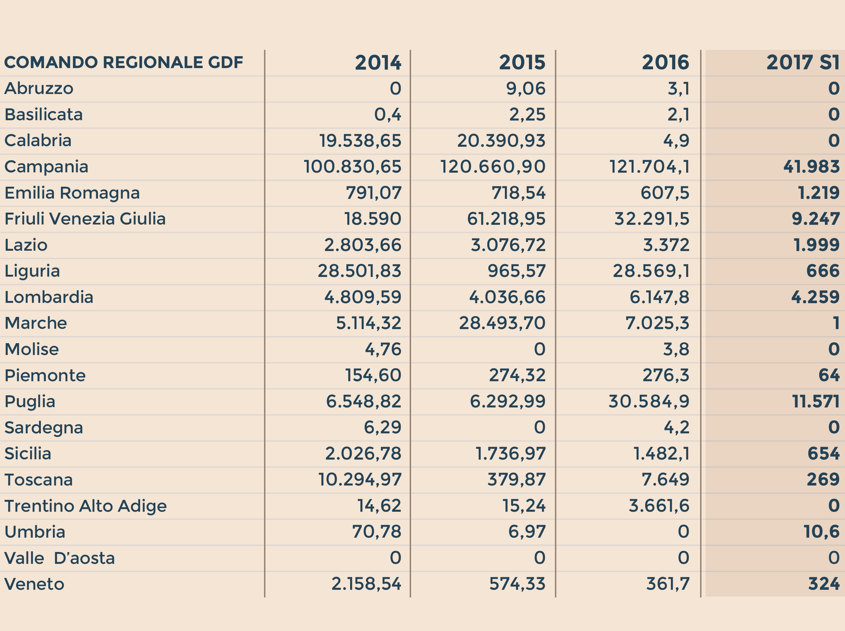 Valori in chilogrammi (Fonte: Dati Stat/1 relativi ai quantitativi di tabacchi lavorati esteri sequestrati dalla Gdf dall’1.1.2014 al 30.06.2017)