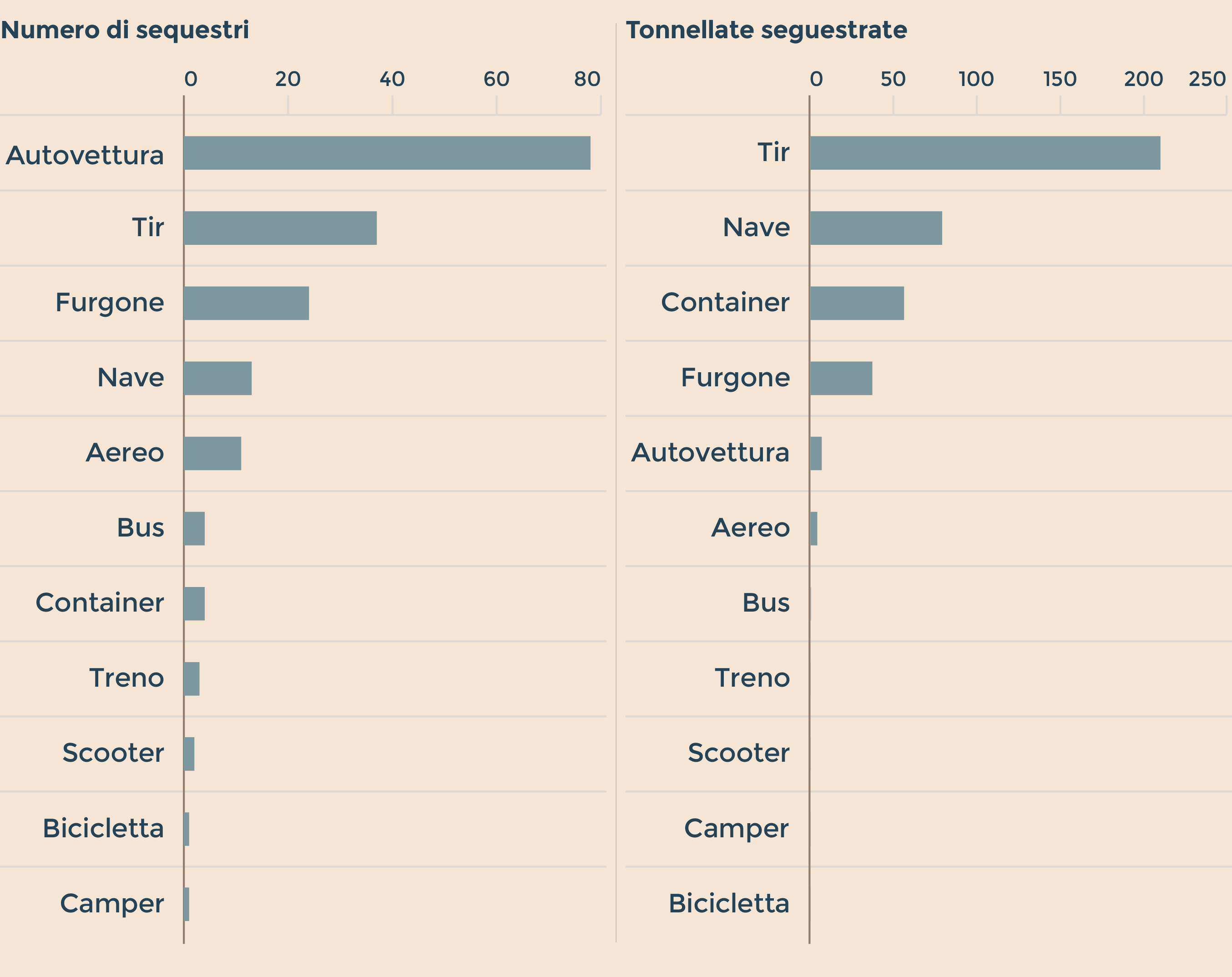 I mezzi utilizzati dai contrabbandieri per trasportare le sigarette illecite. Valori assoluti (Fonte: elaborazione Intellegit di dati BAT Italia sui sequestri 2015-2016)